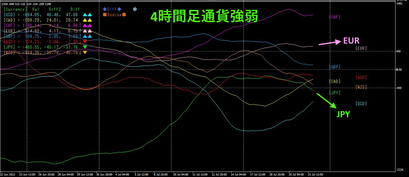 ピンク色がEUR、緑色がJPYです。EURはJPYよりも上に位置していて、上方向、JPYは、下方向なので、今後EURJPYは上昇することになりますが、直近高値付近に到達しているので、伸び悩むかもしれません。