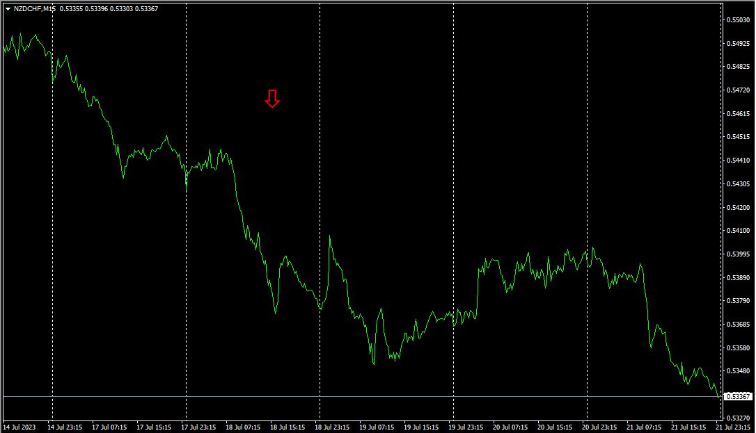 赤色の矢印がスクリーンショットを撮影した所です。右肩下がりの下降トレンドの途中です。全体的な方向としては下降方向なので、戻り売りに徹すれば、利益になります。直近高値に損切を入れておき、週末までホールドでも良いですね。