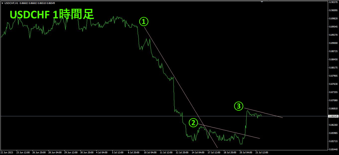 USDCHFは、「大底から反転」のフェーズに入ってきているので、①~③のように、切り下げラインを引いておき、これを上抜けて来たら買いでエントリーするだけです。トレードがとてもシンプルなので、色々と悩まなくて良くなります。