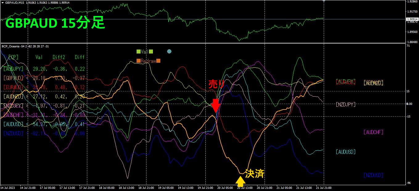 木曜日にGBPAUDが他のグラフ群を下抜けしてきたので売りエントリーします。グラフが底に達したので、決済します。約120pipsの利益が得られました。