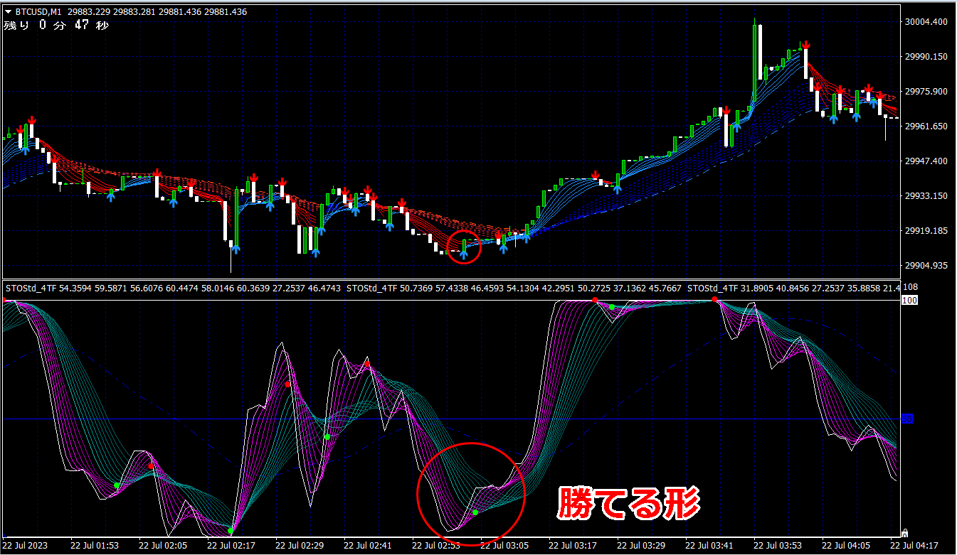 ② 矢印サイン点灯状態で、インジケーターのピンク色の帯が、緑の帯を下からすくい上げるような形状であれば、現在のローソク足が確定する数秒前か確定の直後に1分判定または3分判定でハイエントリーします。