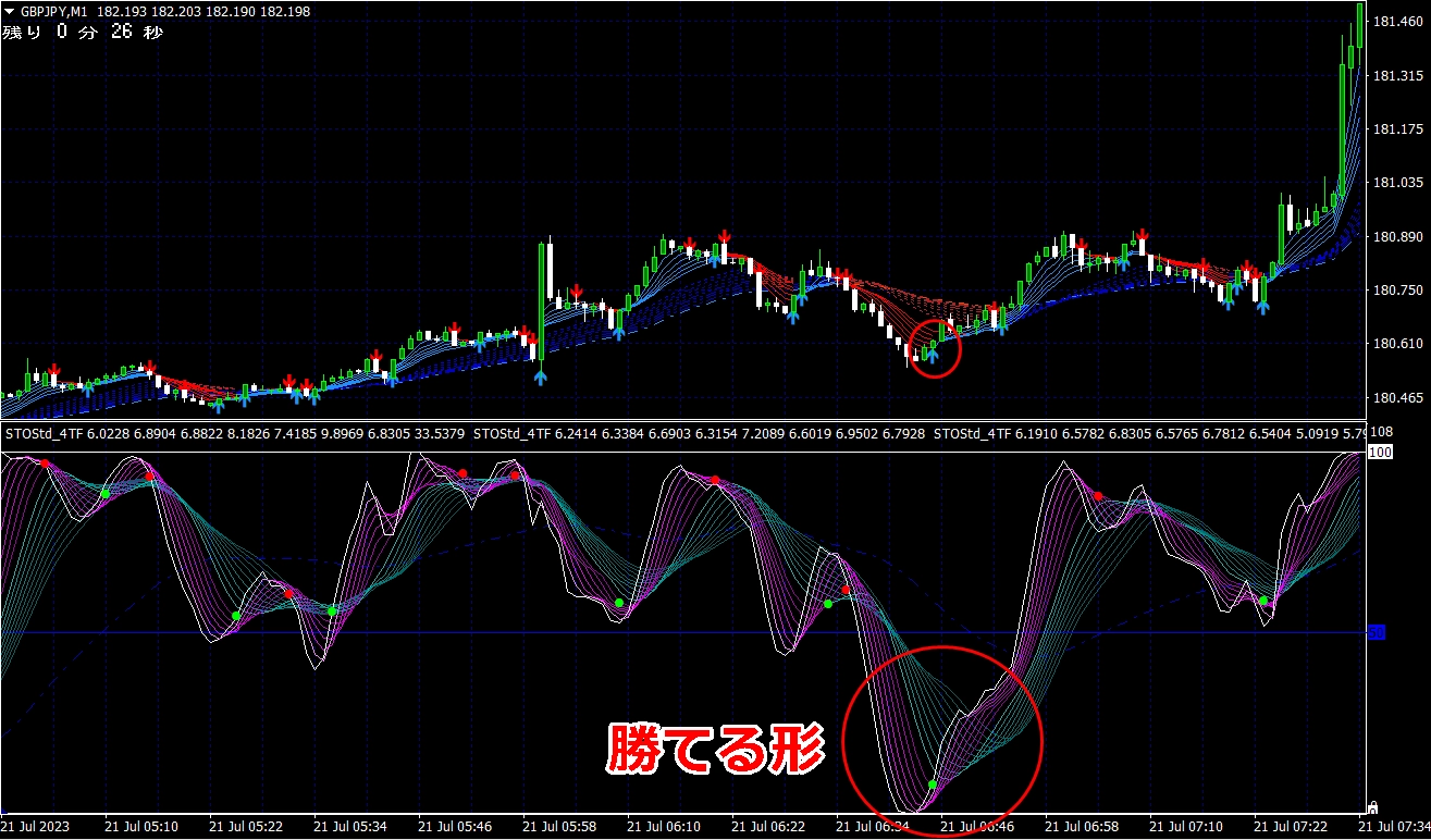 ② 矢印サイン点灯状態で、インジケーターのピンク色の帯が、緑の帯を下からすくい上げるような形状であれば、現在のローソク足が確定する数秒前か確定の直後に1分判定または3分判定でハイエントリーします。
