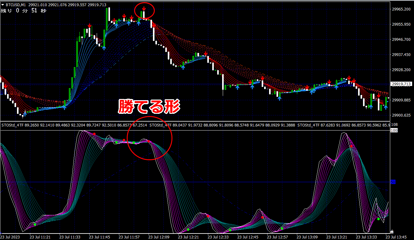② 矢印サイン点灯状態で、インジケーターのピンク色の帯が、緑の帯を下からすくい上げるような形状であれば、現在のローソク足が確定する数秒前か確定の直後に1分判定または3分判定でハイエントリーします。