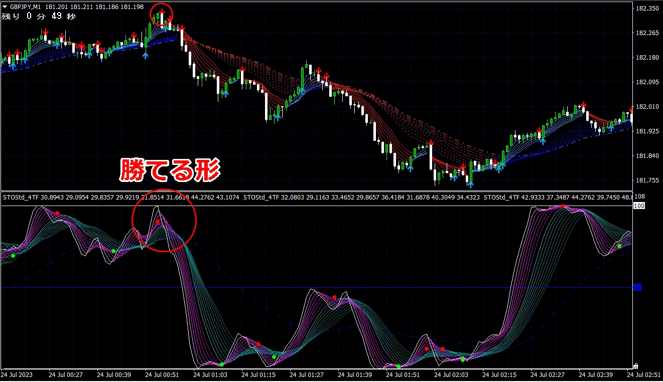 ② 矢印サイン点灯状態で、インジケーターのピンク色の帯が、緑の帯を下からすくい上げるような形状であれば、現在のローソク足が確定する数秒前か確定の直後に1分判定または3分判定でハイエントリーします。