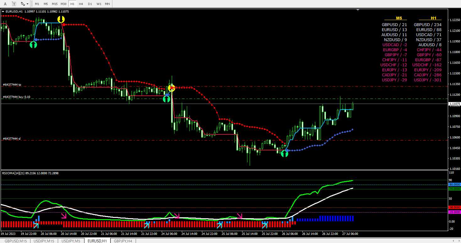 EUR/USDの1時間足のRSIOMAのラインは密着の前兆が無く、大きく間隔が開いておりまだ伸びしろがある事が分かったからです。