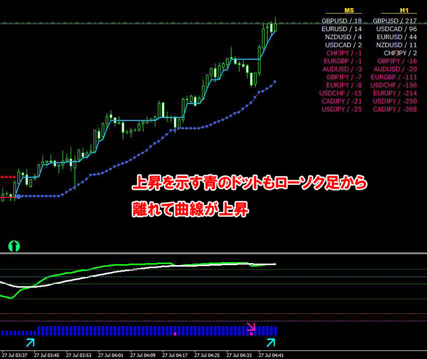 目安の一つとなるサイン発生から、青のドットがキレイな曲線で上昇しています。
