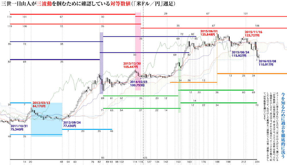 三世一目山人が三波動を掴むために確認している対等数値(「米ドル/円」週足)