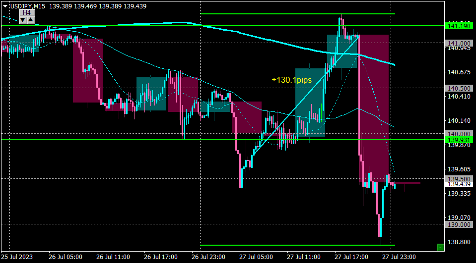 朝のシナリオ通り押し目買いの動きで141.0付近まで上昇したので、H4の足のクローズでイグジット。+130pips