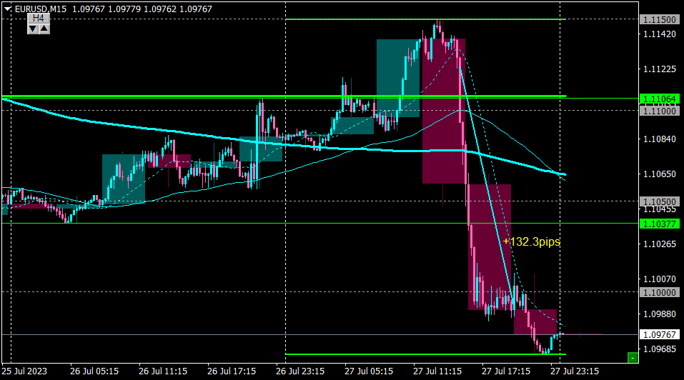 昨日は1.1150の節目で上げ止まったところでM15レベルの三尊を形成。そのネック割れでショート。+132pips