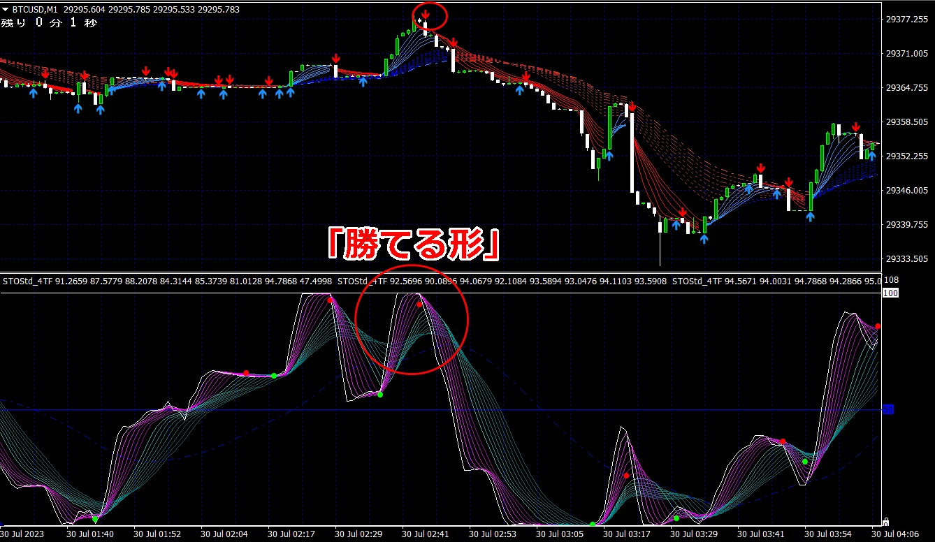 ② 矢印サイン点灯状態で、インジケーターのピンク色の帯が、緑の帯を下からすくい上げるような形状であれば、現在のローソク足が確定する数秒前か確定の直後に1分判定または3分判定でハイエントリーします。