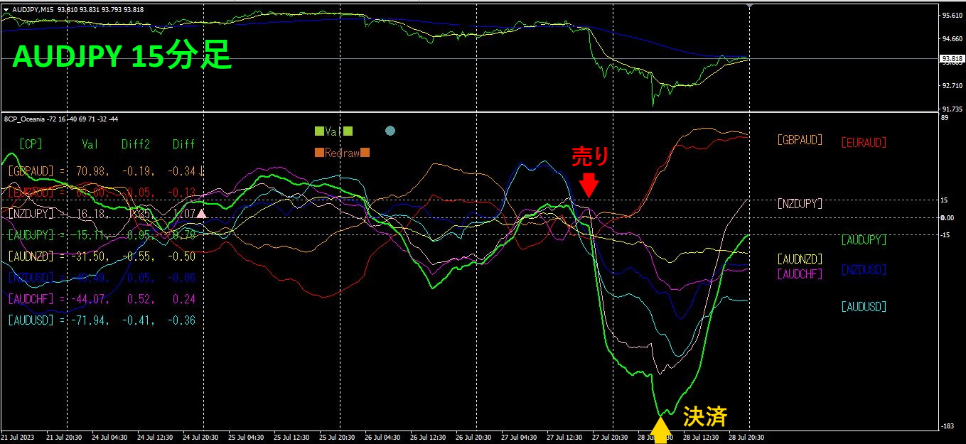 上半分は、AUDJPYの15分足チャートです。下半分は、「8CP見える化インジケータ」によるものです。緑色太線のグラフがAUDJPYに相当します。