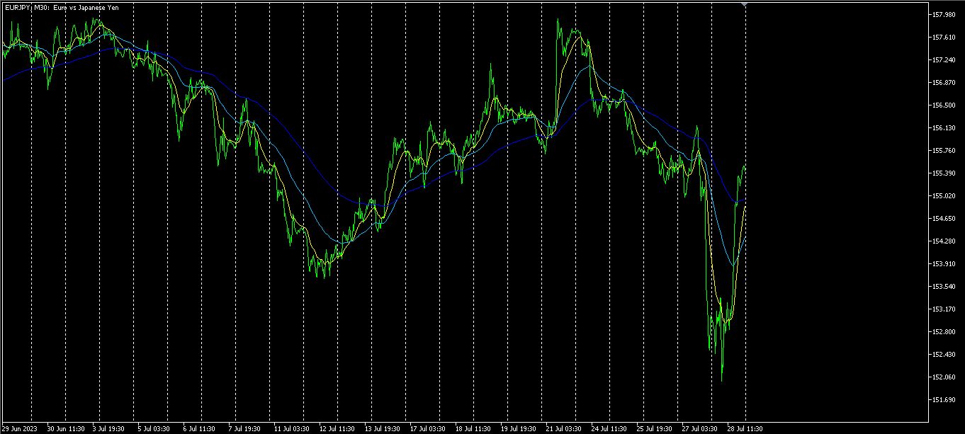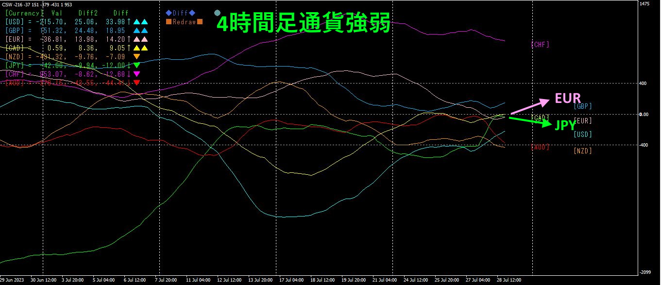 ピンク色がEUR、緑色がJPYです。EURはJPYよりも上に位置していて、上方向、JPYは、下方向なので、今後EURJPYは上昇することになります。
