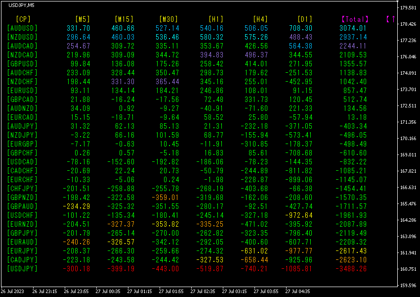Total数値の降順に並び替えています。一番下の行のUSDJPYは、全時間足で赤系の表示色になっていて、Total数値が-3488.26と大きなマイナスの数字になっています。USDJPYに大きな下降トレンドが発生していることを示しています。