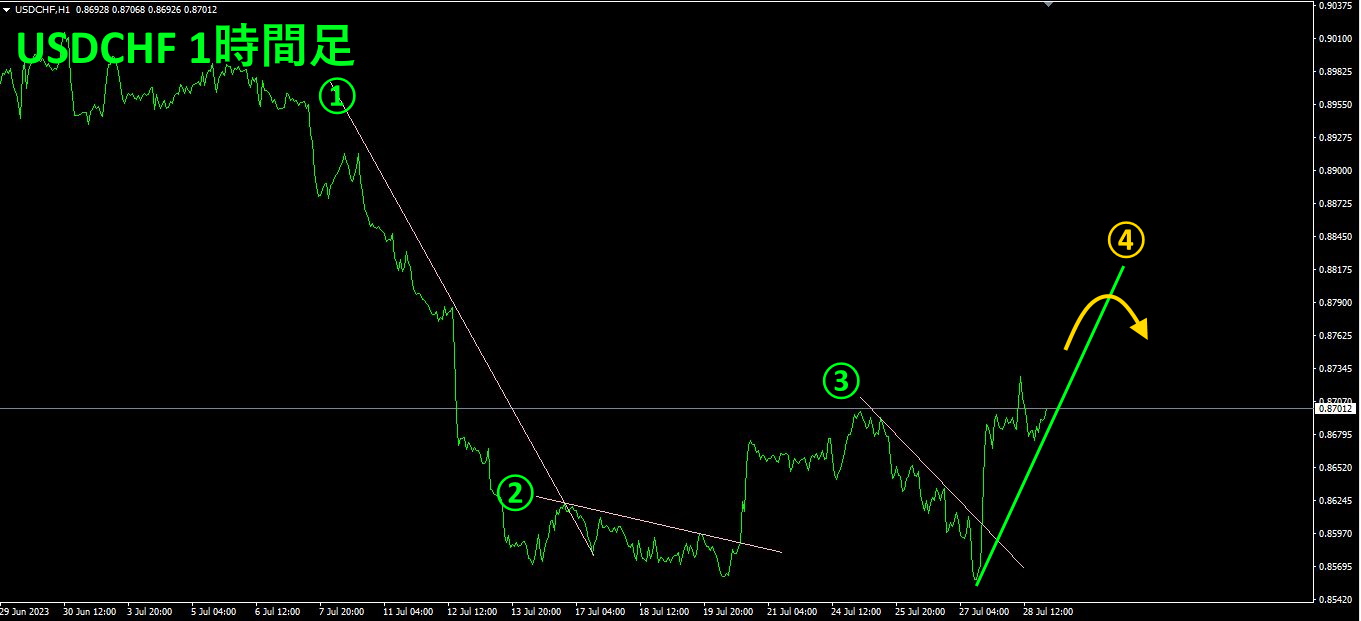 USDCHFは、「大底から反転」のフェーズなので、①~③のように、切り下げラインを引いておき、これを上抜けて来たら買いでエントリーします。トレードがとてもシンプルになります。今は、③の切り下げラインを上抜けした所で、買いポジションを建てて、④の切り上げラインを割り込んで来るまで待っている状態です。含み益が85pipsあります。