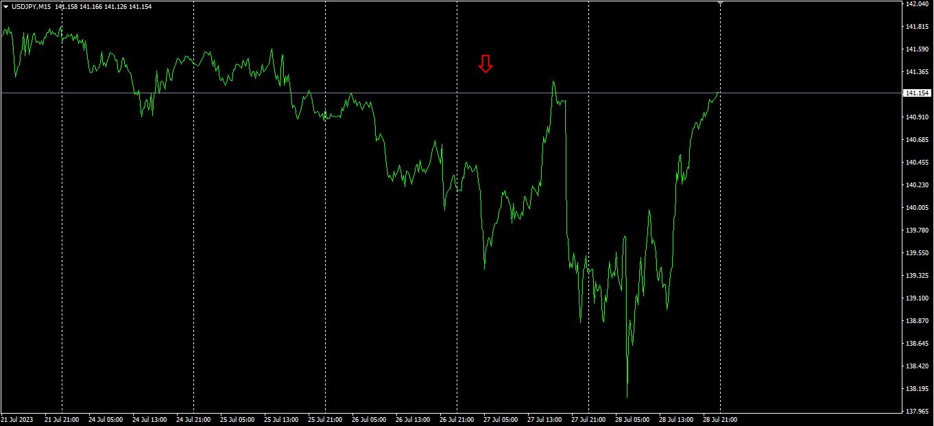 赤色の矢印がスクリーンショットを撮影した所です。右肩下がりの下降トレンドの途中です。その後レートは上に戻しましたが、翌日はさらに下降しました。