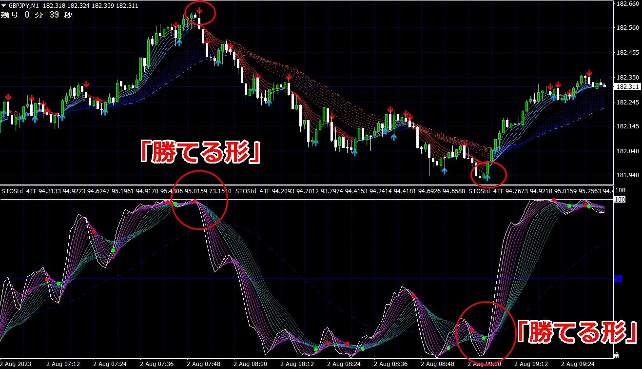② 矢印サイン点灯状態で、インジケーターのピンク色の帯が、緑の帯を下からすくい上げるような形状であれば、現在のローソク足が確定する数秒前か確定の直後に1分判定または3分判定でハイエントリーします。