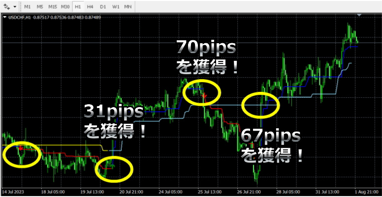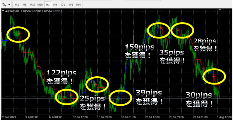 AUD/NZDで122pipsを獲得!トレンド売買サインインジケーター。ラインと矢印で究極の売買ポイントを表示。(2023年8月2日の実績)