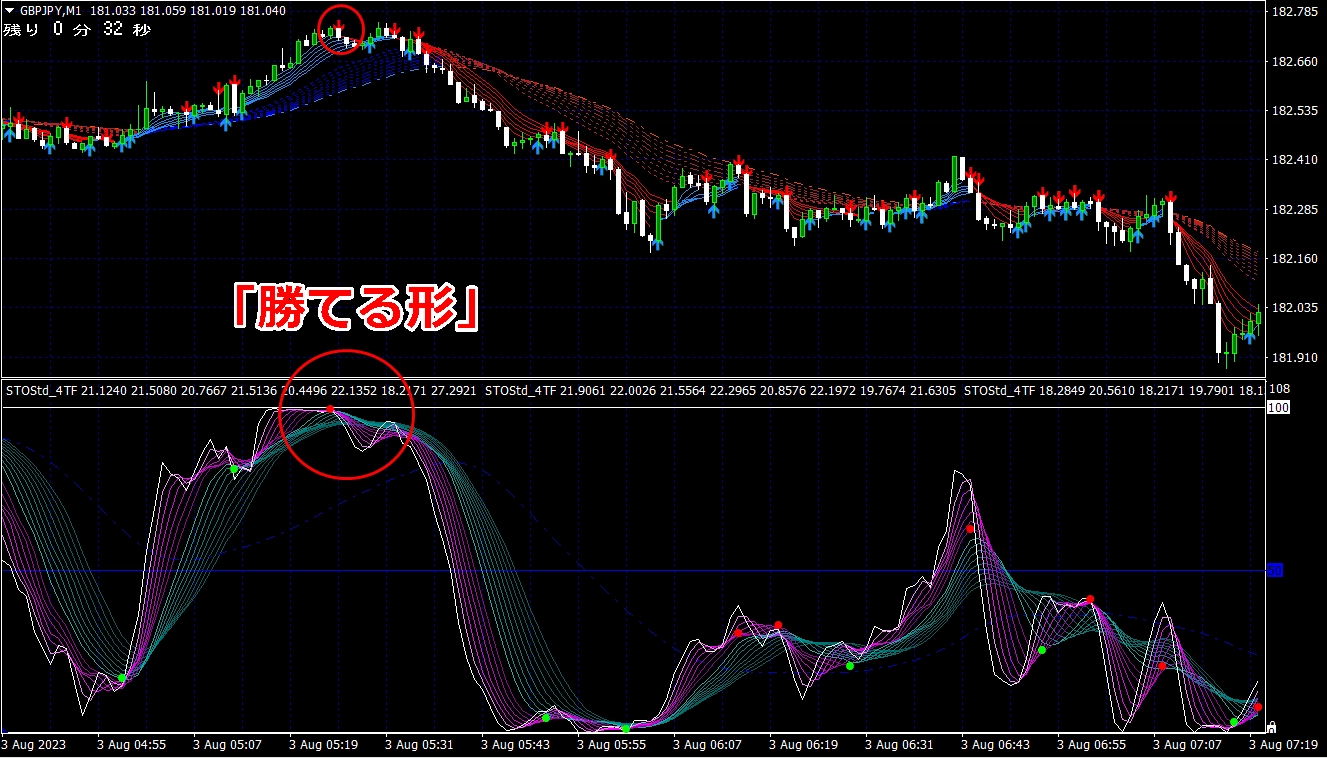 ★ サイン点灯後、ピンク帯が緑帯に覆いかぶさる、またはすくい上げる形状で必勝エントリー!