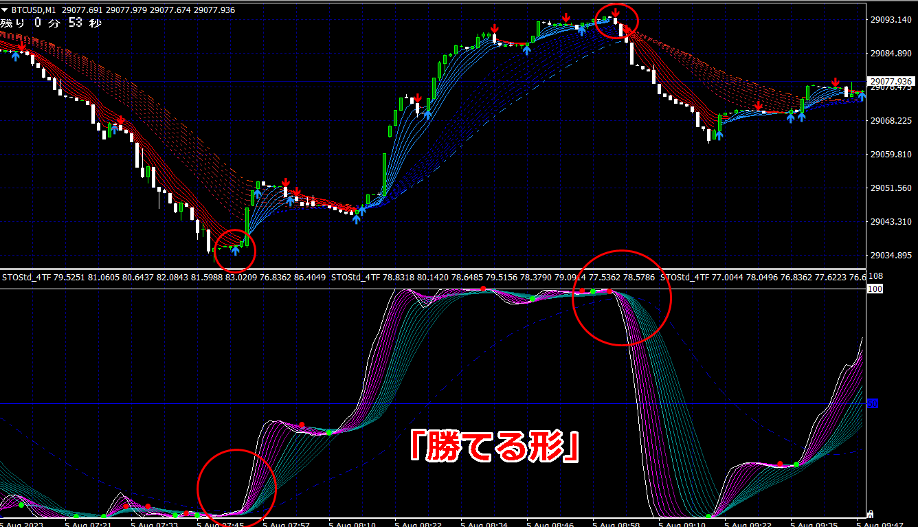 ② 矢印サイン点灯状態で、インジケーターのピンク色の帯が、緑の帯を下からすくい上げるような形状であれば、現在のローソク足が確定する数秒前か確定の直後に1分判定または3分判定でハイエントリーします。