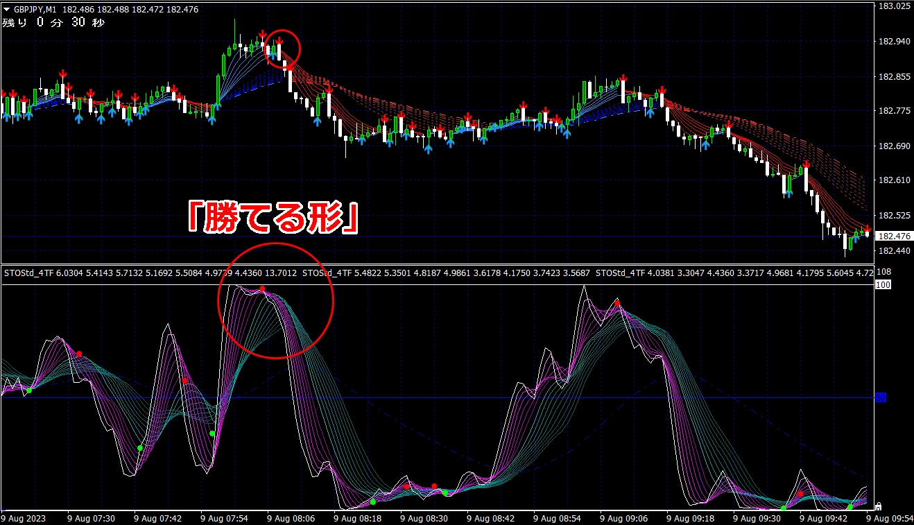 ② 矢印サイン点灯状態で、インジケーターのピンク色の帯が、緑の帯を下からすくい上げるような形状であれば、現在のローソク足が確定する数秒前か確定の直後に1分判定または3分判定でハイエントリーします。