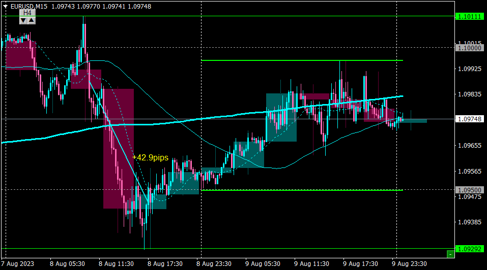 〇前日のトレード・USDJPY ドル円(15分足)昨日は先週安値141.50付近での値動きにとどまったためノートレード。・EURUSD ユーロドル(15分足)昨日は1.090付近でのプライスアクション