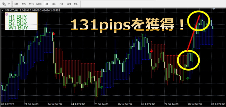 1時間足で取引をしてください。H1からW1の4つのサインが、3つ以上同じ方向でしたら、大きなトレンドに乗れます。
