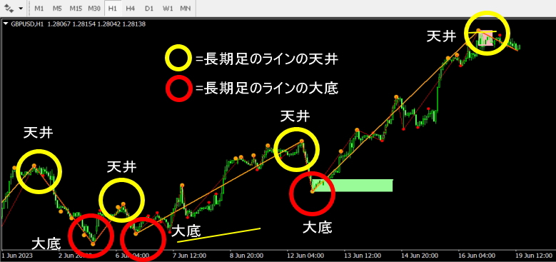 - ラインの大底と天井とオーダーブロックのボックスが重なる所は、大きく反転しやすい。