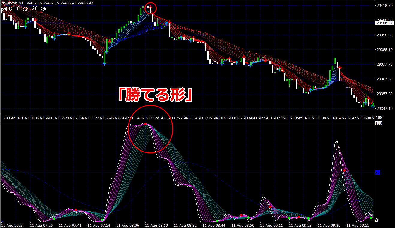 ② 矢印サイン点灯状態で、インジケーターのピンク色の帯が、緑の帯を下からすくい上げるような形状であれば、現在のローソク足が確定する数秒前か確定の直後に1分判定または3分判定でハイエントリーします。