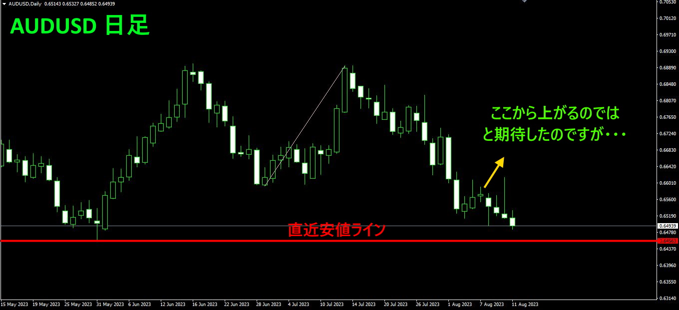残念ながら、なかなか上がってきませんでした。以下はAUDUSDの日足チャートです。