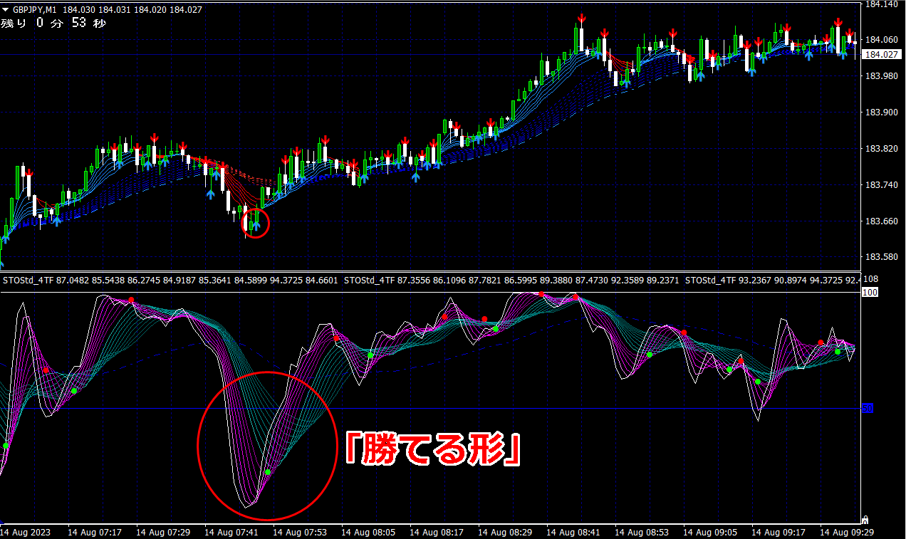 ② 矢印サイン点灯状態で、インジケーターのピンク色の帯が、緑の帯を下からすくい上げるような形状であれば、現在のローソク足が確定する数秒前か確定の直後に1分判定または3分判定でハイエントリーします。
