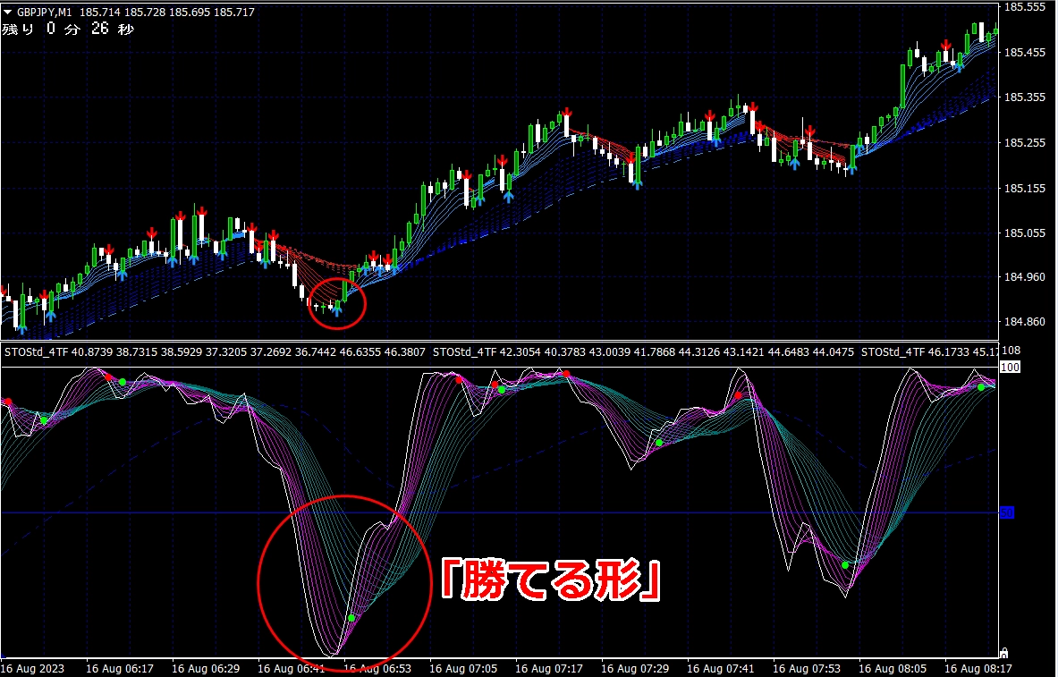 ② 矢印サイン点灯状態で、インジケーターのピンク色の帯が、緑の帯を下からすくい上げるような形状であれば、現在のローソク足が確定する数秒前か確定の直後に1分判定または3分判定でハイエントリーします。