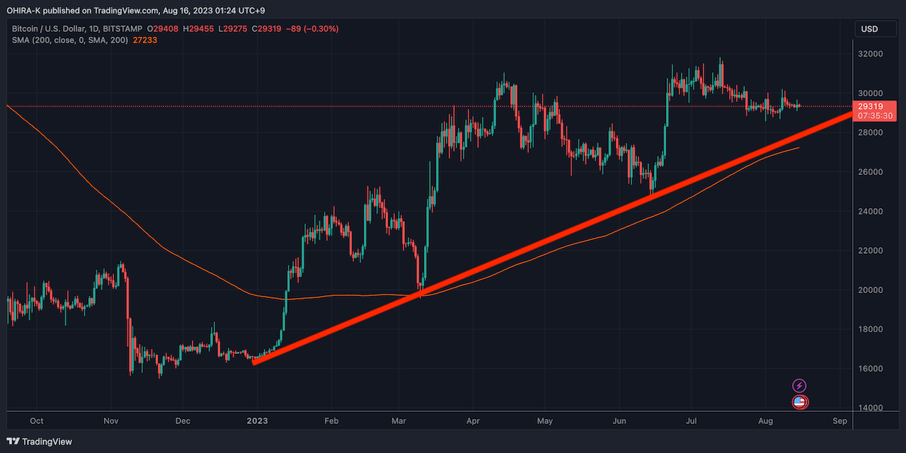 赤線で引いたトレンドラインに価格が近づいている感じで、またオレンジの200日移動平均線も近づいています。