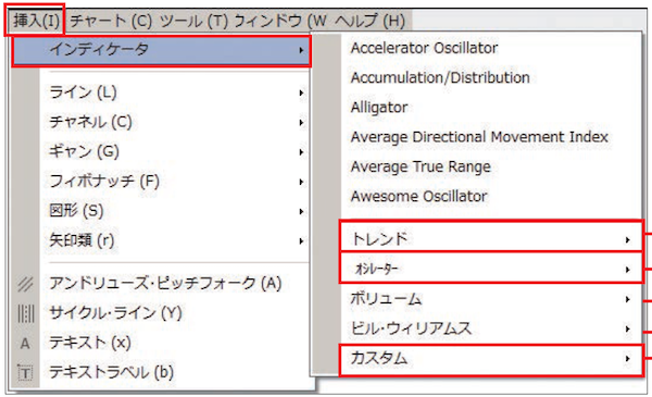 「カスタム」:FX会社特有の指標を格納。また自分で追加したインジケーターもここに格納されます
