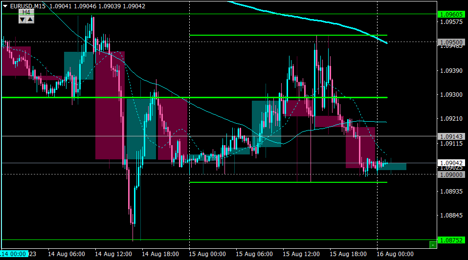 〇前日のトレード・USDJPY ドル円(15分足)昨日は先週安値141.50付近での値動きにとどまったためノートレード。・EURUSD ユーロドル(15分足)昨日は1.090付近でのプライスアクション