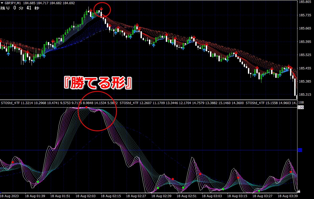 ② 矢印サイン点灯状態で、インジケーターのピンク色の帯が、緑の帯に上から覆いかぶさるような形状であれば、現在のローソク足が確定する数秒前か確定の直後に1分判定または3分判定でローエントリーします。