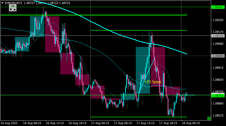 H1の足が下ヒゲになり上昇し始めたところでロング。+23pips