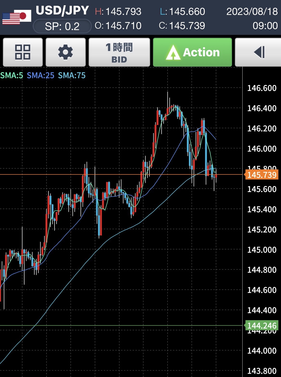 現在のドル円1時間足チャートは、億トレチャートで見ることができる重要ライン14583を切り下げております。