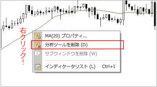 A17. テクニカル指標上で右クリックをして「分析ツールを削除」を選びます