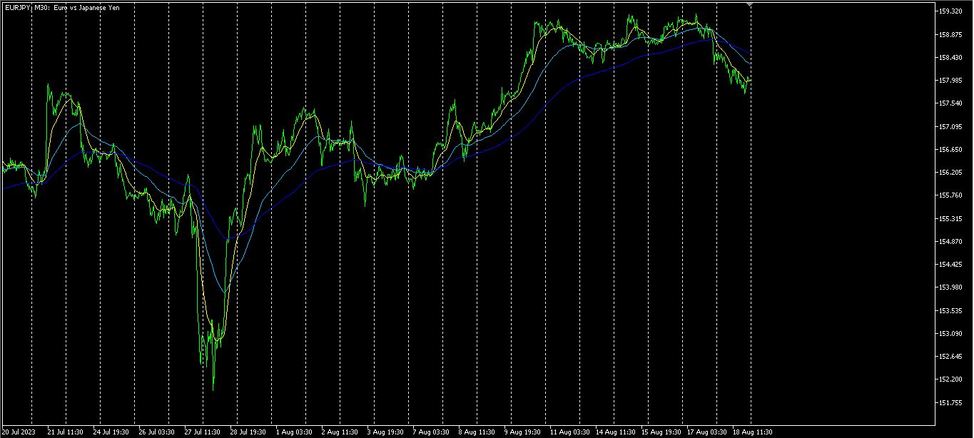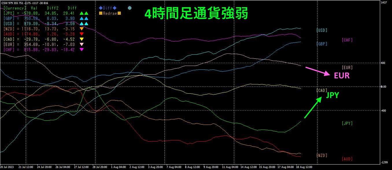 ピンク色がEUR、緑色がJPYです。EURはJPYよりも上に位置していて、やや下方向に向いています、一方JPYは大きく上を向いてきました。今後EURJPYは下落することになるでしょう。