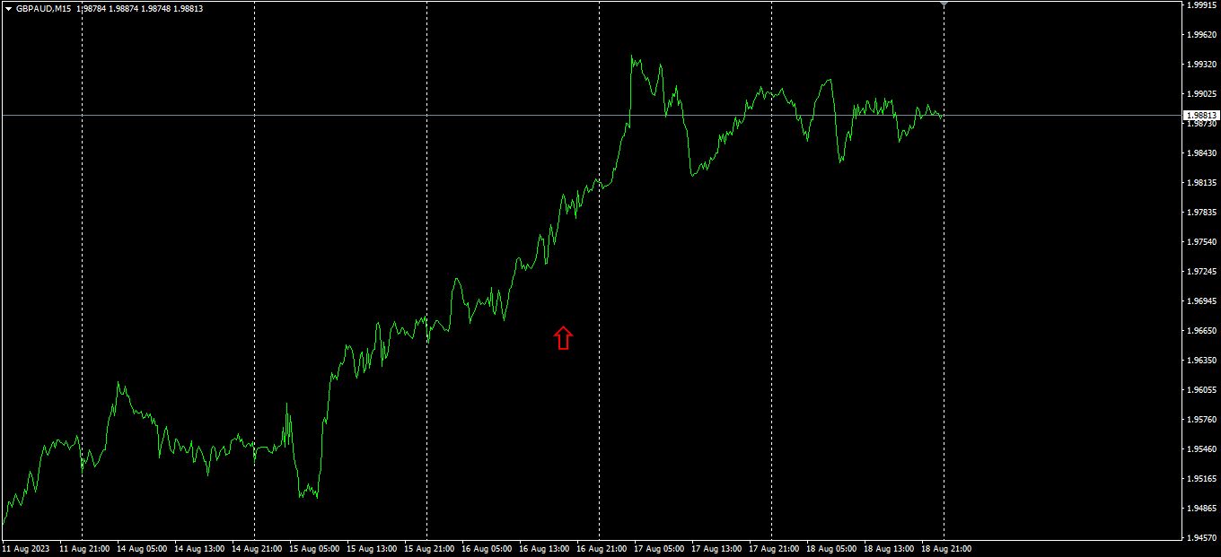赤色の矢印がスクリーンショットを撮影した所です。右肩上がりの大きな上昇トレンドの途中です。矢印以降も上昇が継続しています。ここから買っても、約140pipsの値幅が取れたことになります。