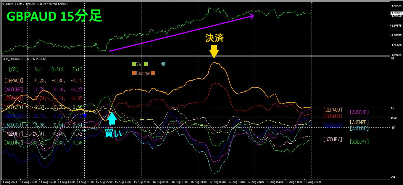 上半分は、GBPAUDの15分足チャートです。下半分は、「8CP見える化インジケータ」によるものです。橙色太線のグラフがGBPAUDに相当します。