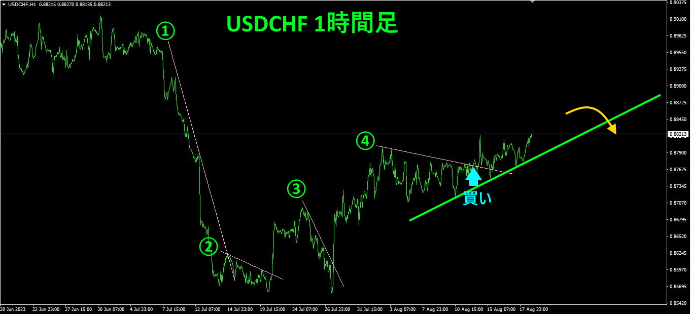 USDCHFは、「大底から反転」のフェーズなので、①~④のように、切り下げラインを引いておき、これを上抜けて来たら買いでエントリーします。④の切り下げラインをレートが上抜けしたので、現在は買いポジションを保有している状態です。今後、緑色の上昇トレンドラインを割ってきたら、決済するだけです。