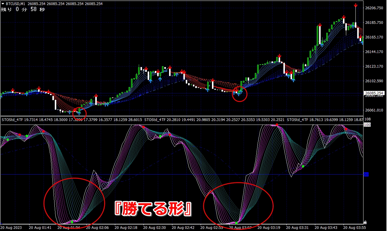 ② 矢印サイン点灯状態で、インジケーターのピンク色の帯が、緑の帯を下からすくい上げるような形状であれば、現在のローソク足が確定する数秒前か確定の直後に1分判定または3分判定でハイエントリーします。