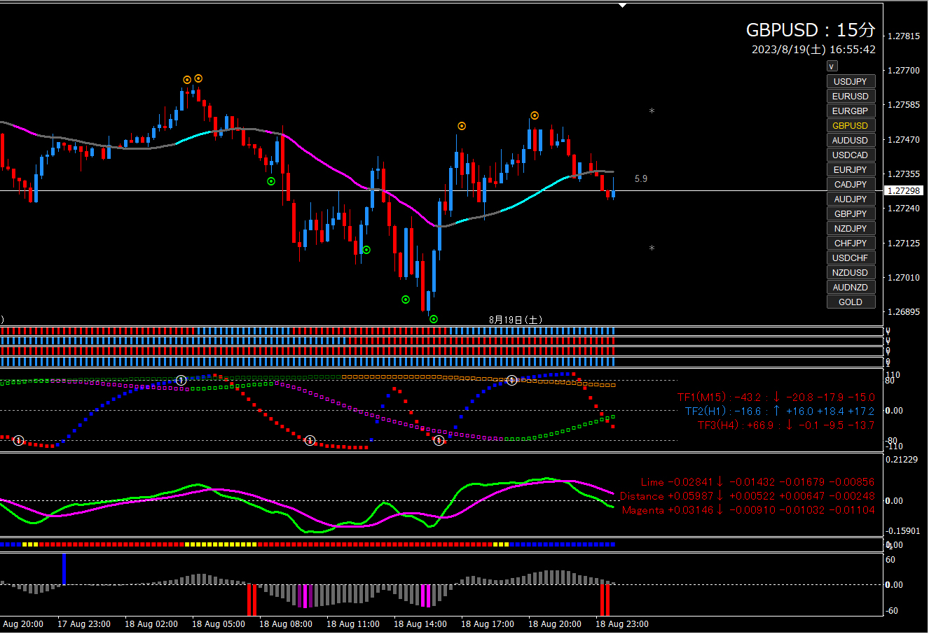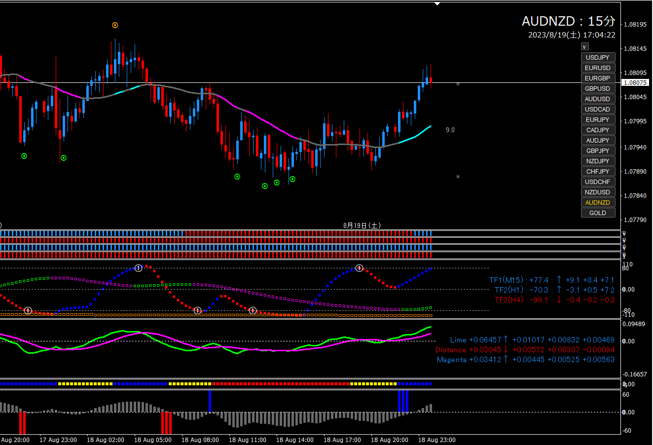 直前にロングの点サイン、オシレーターTF2も上昇中、ヒストグラムDXも青。ユロ円同様に良い上目線の形状です。クロス円なので当然と言えば当然なのですが。考察もユロ円と同じです。オシメーターDXが既に↓なので上昇クロスへ向かっていると予測できます。