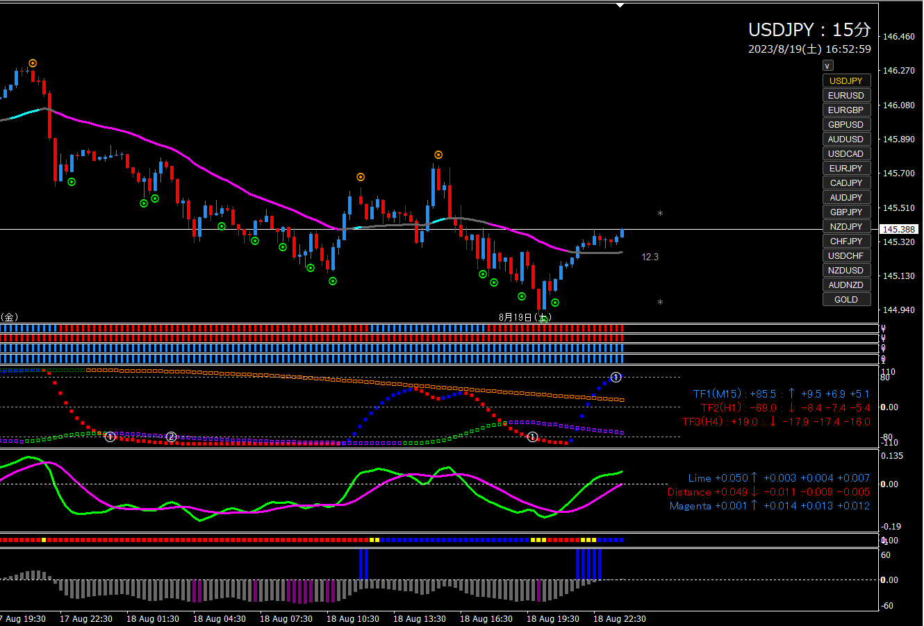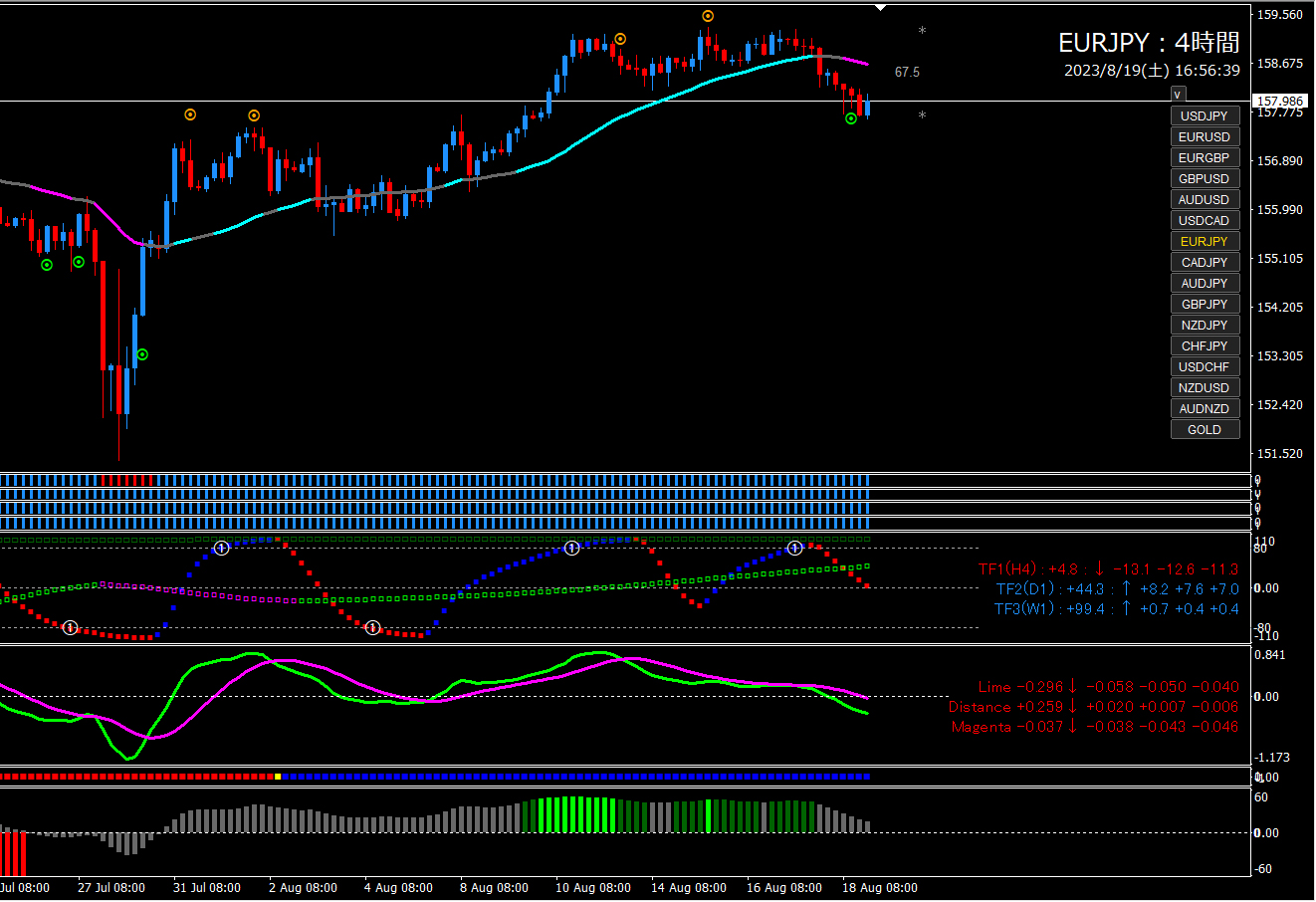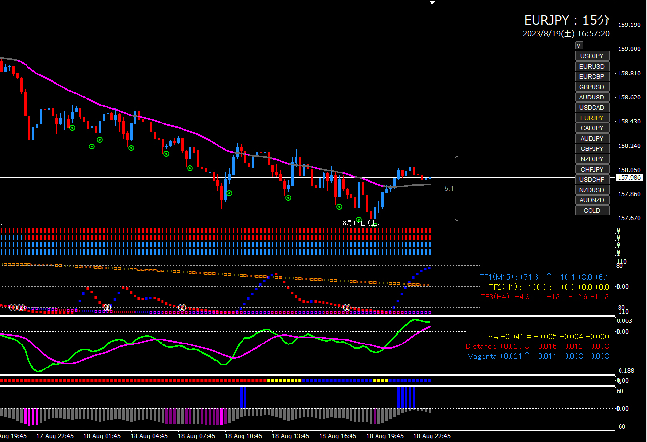 オシレーターTF1がようやく下降を始めました。しかし今の段階では目線は決められません。オシレーターTF1が再度上昇し始めたら、もしくはオシレーターDXが上昇クロスをしたら、もしくはオシメーターDXが↓に転換したら上目線と判断します。その場合、ヒストグラムも全揃いしていますし、強い押し目となりますね。
