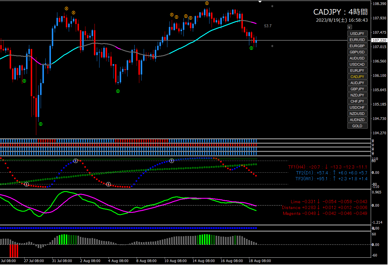 こちらもユロ円、カナダ円と同じ形状ですね。今後のシナリオも同様です。オシレーターTF2が上昇を始め、ロングの点サインなどのトリガーでエントリーという流れです。