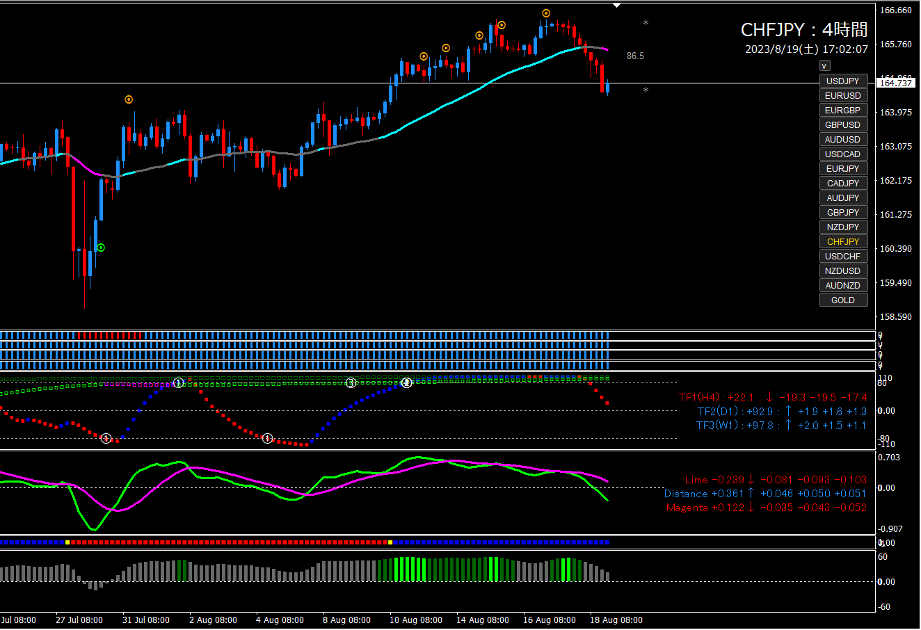 クロス円なので、ユロ円、カナダ円と同様の形状です。オシメーターDXのDistanceが↑と表記されています。これは直前に比べて収縮が広がっているという事を指しているので、まだ下がる可能性があるという事になります。Distanceが↓になったら完全に上目線と判断します。