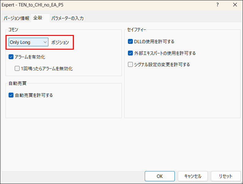 パラメーターを画像のようにする事で、上昇クロスのみを待つようになります。例えば現在のチャートにEAパターン⑤をセットしてしまうと下降クロスで自動ショートエントリーをしてしまいます。パラメーターでロングオンリーの設定にする事でこの下降クロスはスルーして上昇クロスで自動ロングエントリーをしてくれます。