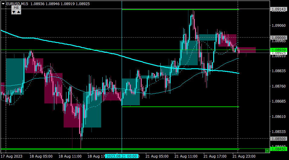 〇前日のトレード・USDJPY ドル円(15分足)昨日は先週安値141.50付近での値動きにとどまったためノートレード。・EURUSD ユーロドル(15分足)昨日は1.090付近でのプライスアクション