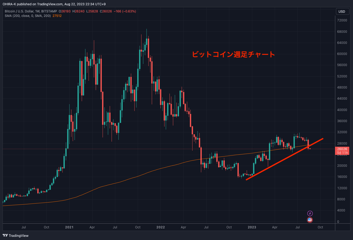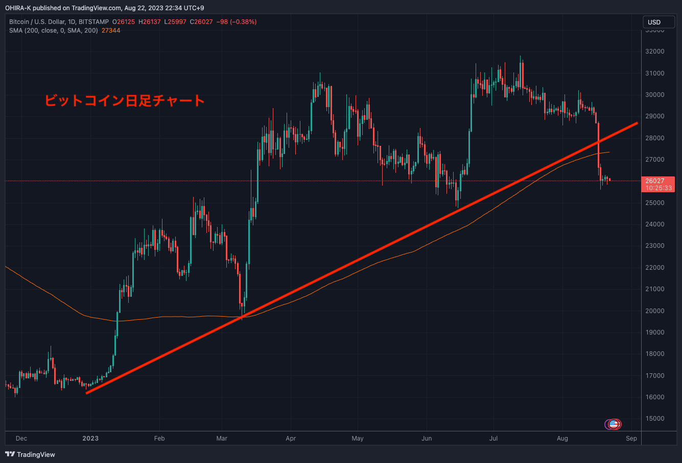 以上からビットコインのチャートを分析すると移動平均線とトレンドラインの両方を下に割っており、今後どこで価格が止まるかが注目されます。